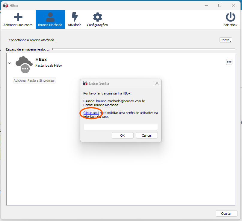 Proceda com a configuração da conta no client Hbox. Caso a configuração de "Palavras-passe da Aplicação" não tiver sido realizada previamente e o duplo fator "TOTP" jÔ tiver sido configurado, o acesso não serÔ bem sucedido e a inserção da senha não permitirÔ o acesso. Caso isso ocorra, clique na opção "Clique aqui" indicada na imagem abaixo: