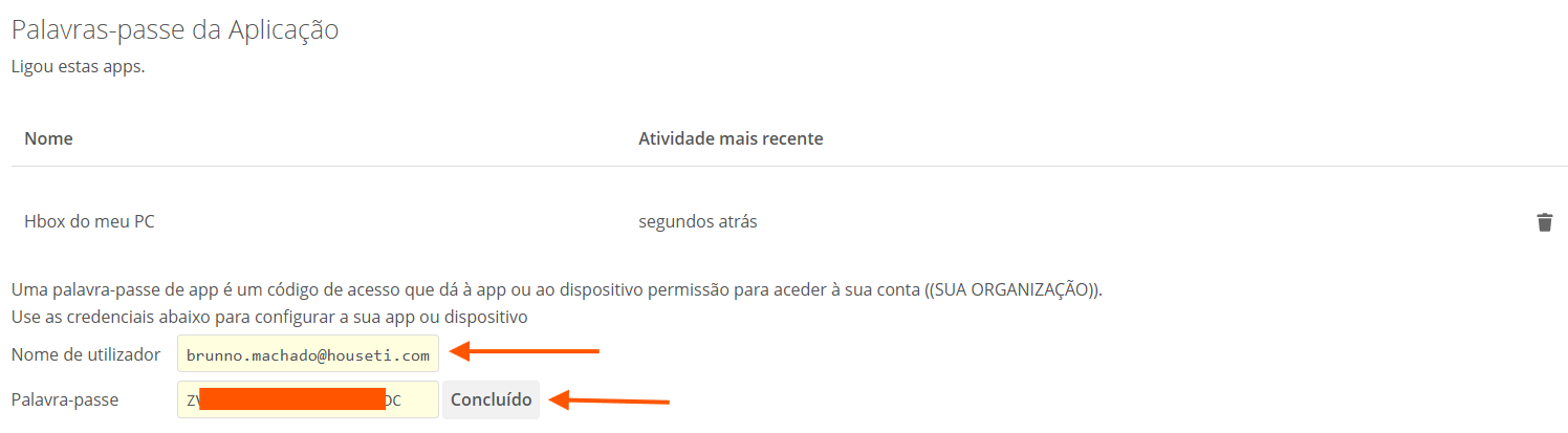 Na opção "Palavras-passe da Aplicação" insira a referencia para a configuração do client que serÔ utilizado. Preencha com nome e copie o "Nome de Utilizador" e a "Palavra-Passe" que serão exibidas. SerÔ com essas informações que logaremos no client: