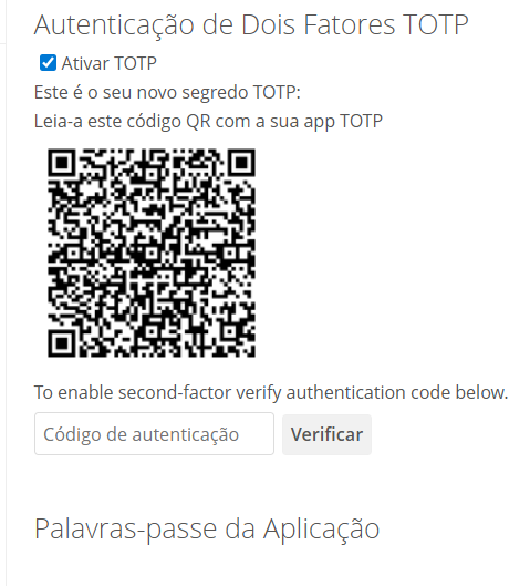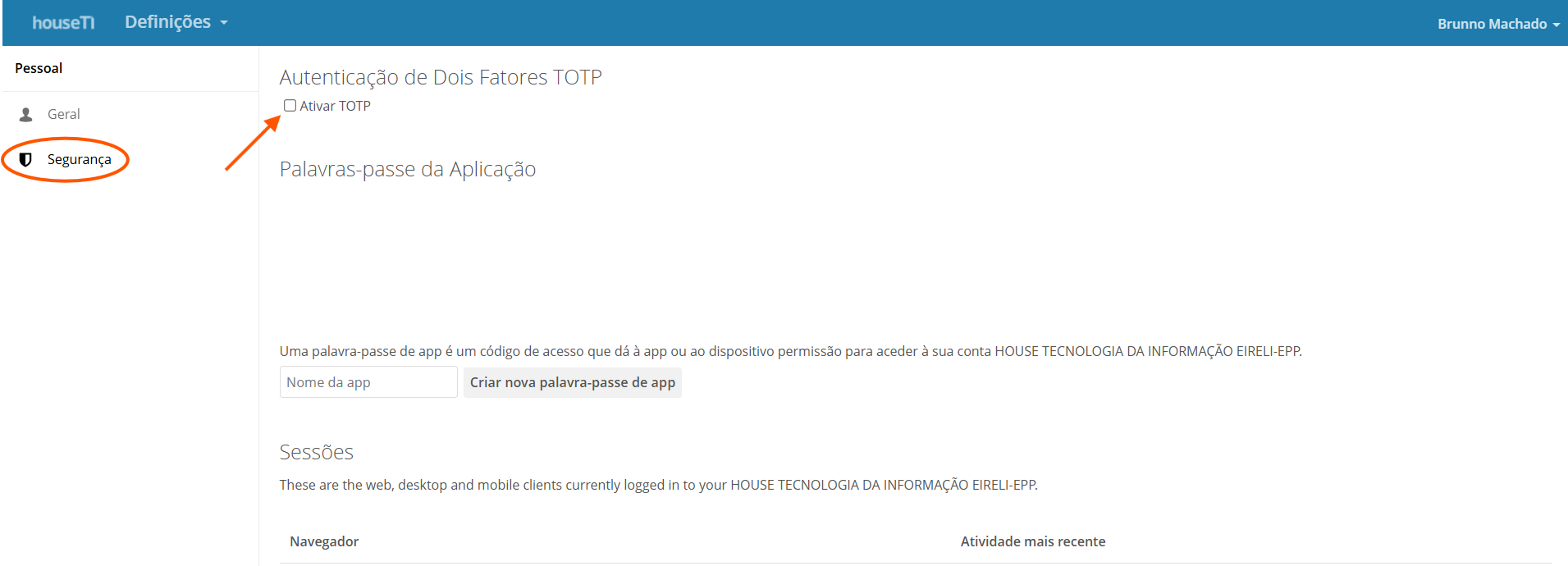 Na aba "Segurança", marque a opção "Ativar TOTP", na opção "Autenticação de Dois Fatores TOTP":