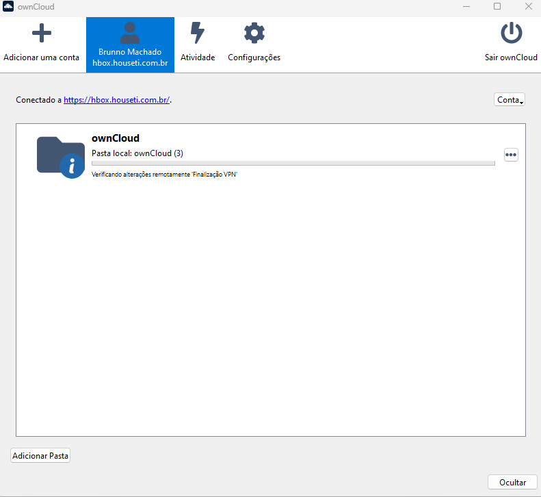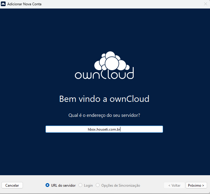 Na opção "Palavras-passe da Aplicação" insira a referencia para a configuração do client que serÔ utilizado. Preencha com nome e copie o "Nome de Utilizador" e a "Palavra-Passe" que serão exibidas. SerÔ com essas informações que logaremos no client:No aplicativo OwnCloud, insira o servidor hbox.houseti.com.br